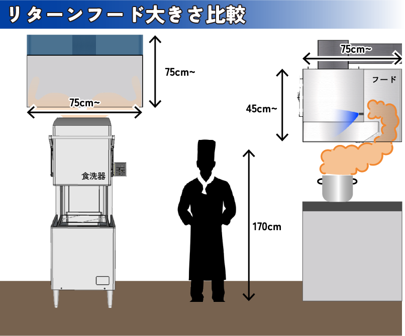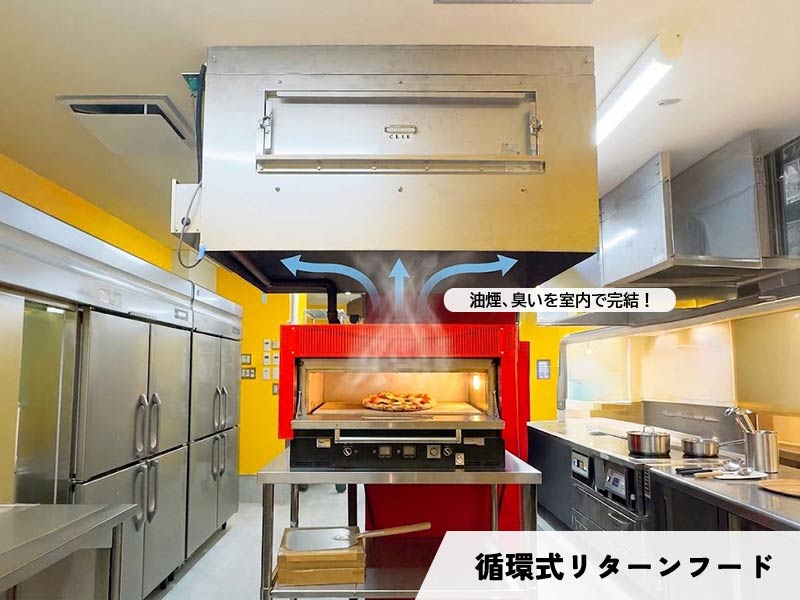 リターンフードは外壁の穴あけや屋上までの配管は不要な循環型排気処理フードです。地下街など地下の店舗や、排気制限のある店舗でもご利用いただけます。