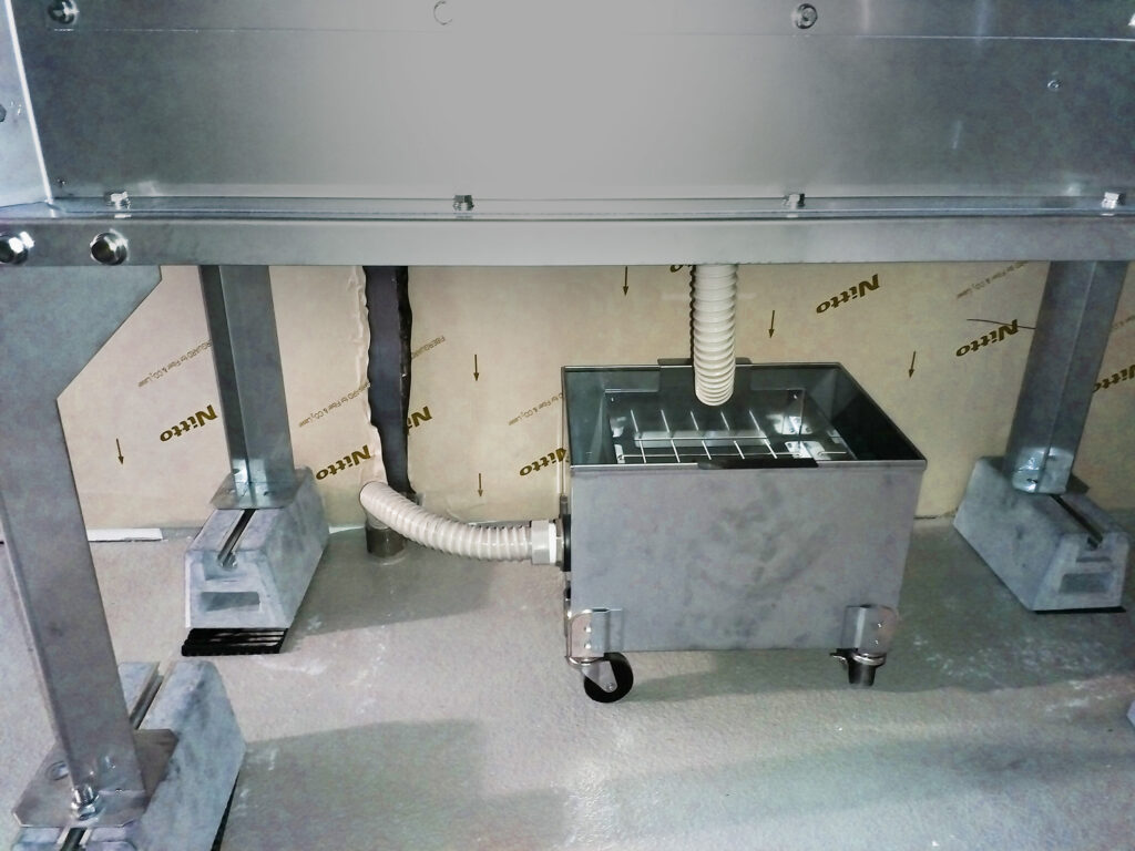 ススとり君とは、ピザ窯等からの排気途中で湿式方法による煤・粉塵の除去をおこなう装置で、薪を燃やした時に出る煤に水分噴霧し凝固させ排出します。