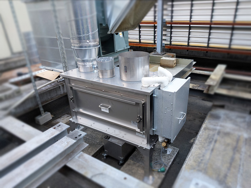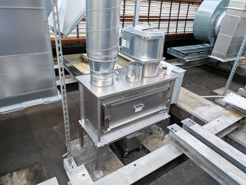 ピザ窯などの排気に含まれるススや煤塵を、水と金属フィルターのチカラで除去、洗浄を行う装置です。