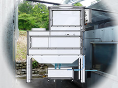 高温空気に水分を噴霧し温度を下げ油脂成分・臭い成分を凝固し排水する消臭装置です。