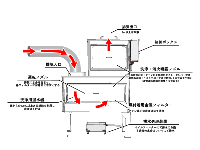 排気に水分を含ませステンレスフィルターに汚れが付着しやすいようにしています。また、フィルター部にも常時水を噴霧することでフィルターに付着した汚れを洗い落とします。
